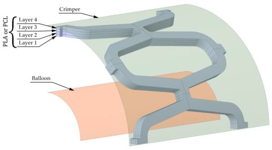 The stent was divided into four layers in the radial direction to study the effects of different material combinations on its mechanical properties. The impact of layer configuration on the mechanical properties of the structure was also investigated (i.e., if there was a significant difference in the mechanical response of a structure made of the same number of layers from each material when the layers were variously placed). Four layers were chosen to limit the number of resulting configurations and to be able to reproduce a configuration where half of a stent was made from one, and half from another material for comparison with available experimental results (stent made of two layers). Two layers are not sufficient to compare different configurations of layer placement, and more than four layers would greatly increase the number of possible configurations while most likely not improving outcomes. Two different materials were used for the four different layers, resulting in sixteen unique stent compositions. The materials that made up the 3D-printed composite stent were intended to have similar manufacturing properties while having different material properties to meet different requirements. Two bioresorbable polymeric materials used for the composite stent were polycaprolactone (PCL) and polylactic acid (PLA). The more rigid PLA would provide support, while PCL would provide sufficient flexibility to conform to the vessel wall. Biodegradation is outside the scope of this article, but PCL degrades more slowly than PLA. Therefore, PLA would provide additional support in the early stages of blood vessel remodelling and be resorbed later to provide more flexibility in the late stages when arterial remodelling is complete. Ideally, PCL would decompose when the vessel is completely healed. The elasto-plastic material properties of the stent materials used in the numerical simulations are listed in Table 2. The material combinations in the stents are indicated by four numbers (e.g., 1010), where 0 and 1 represent PLA and PCL, respectively. The numbers represent the layers in order, as shown in Figure 2, where the first number represents the innermost layer (layer 1), and the last number represents the outermost layer (layer 4). For the balloon, a hyperelastic material is considered with a two-parameter material model Mooney−Rivlin (C10 = 1.069 MPa; C01 = 0.7109 MPa) adopted from Ju et al. [34]. For the steel crimper, a linear elastic material model with Young’s modulus of 210 GPa and Poisson’s ratio of 0.3 was used. The thickness of the balloon and the crimper is 0.1 mm and 1 mm, respectively.