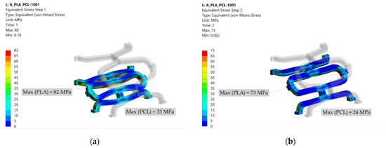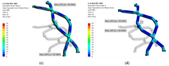The stresses resulting from crimping and expansion depend on the material composition of the stent. The stresses are displacement induced; therefore, lower stresses are expected in the material with the lower modulus of elasticity (i.e., PCL). The results of the equivalent stresses (von Mises) at the end of each simulation step for configuration 1001 are shown in Figure 6. Equivalent stresses after crimping are shown in Figure 6a. The highest stress in PLA occurs at the contact between the struts, while the highest stress in PCL occurs at the unit cell radius. The yield stress (65 MPa for PLA and 25 MPa for PCL) is exceeded, and plastic deformation occurs in the red and green regions for PLA and PCL, respectively. After removing the crimper, the stent may expand to a certain extent (recoil). Return to the initial state is not possible due to irreversible deformation in some areas by crimping. As a result, some residual stresses remain, which can be seen in Figure 6b. These stresses are still above the yield stress for PLA, while they fall into the elastic region for PCL. Stress concentrations occur at the radii of the unit cell for both PLA and PCL since there is no contact between the struts. The highest stresses occur during the expansion of the stent, as shown in Figure 6c. Stress concentrations occur at the intersection of the unit cell with the connecting strut bridging the unit cells and exceed the yield stress for both PLA and PCL. Therefore, these areas are subject to additional plastic deformation. After stent expansion, a slight decrease of stent diameter may be observed when the balloon is removed. The spring back depends on the material composition of the stent and the degree of plastic deformation. High residual stresses can be seen in Figure 6d.