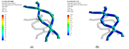 Similar stress distribution was observed in other composite combinations where the different material layers were separated by a clear line. The residual stresses in PLA-only (0000) and PCL-only (1111) stents after the last simulation step (after balloon inflation and removal) are shown in Figure 7 for comparison with the composite structures. In the PLA stent, the stresses appear to be slightly more evenly distributed across the structure than in the composite stent. In addition, fewer stress concentrations are seen in the PLA-only (0000) and PCL-only (1111) stents than in the composite stent (1001). On the other hand, it is immediately apparent that the pure PCL stent experiences greater elastic recoil due to material flexibility.
