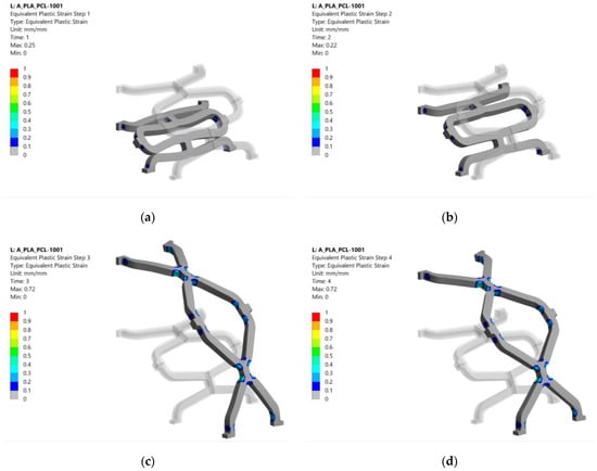 The equivalent plastic strain in configuration 1001 after each analysis step is shown in Figure 8. Equivalent plastic strains after crimping are shown in Figure 8a. Plastification occurs at the radii of the strut intersections, especially at the PLA layers that coincide with the highly stressed regions. The plastic strain remained almost the same after the crimper was released, as shown in Figure 8b. The highest plastic strains were caused during the expansion of the stent. Again, they were located near the strut intersections visible in Figure 8c. After deflation of the balloon, the stent retained most of its deformed shape from the previous step. The remaining plastic strain after removal of the balloon can be seen in Figure 8d.