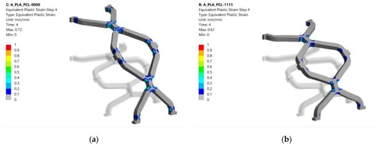 The equivalent plastic strains after the last simulation step (balloon deflation) for pure PLA (0000) and PCL (1111) stents are shown in Figure 9 for comparison with the composite stent in Figure 8. Configuration 0000 had a slightly larger plastic area than the other configurations. In contrast, configuration 1111 had an 11% lower equivalent plastic strain, although the area affected was virtually the same as that of the composite stent (1001). This is due to the higher compliance of PCL (lower Young’s modulus, E), which results in lower stresses when loaded with the same displacement compared to PLA. Lower stresses in PCL exceed the yield stress less than in PLA, resulting in lower equivalent plastic strain.