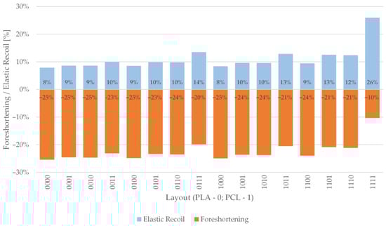 The configurations with three PLA layers and a single PCL layer showed similar behaviour with approximately the same foreshortening of −25%. The only difference was seen in the elastic recoil, which was 8% for the configuration 1000 and 9% for the others. Configuration 1000 contained the lowest volume ratio of PCL; therefore, it behaved most like configuration 0000, for which the same results were obtained (ER = 8%; f = −25%). Similar observations apply to the configurations with the same number of PCL and PLA layers. Composite stents with two PCL and two PLA layers had elastic recoil values between 9 and 10%, while foreshortening was between −23 and −24%. Stents with three PCL and one PLA layer had elastic recoil values between 12 and 14%, while foreshortening was between −20 and −21%.