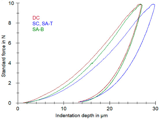 Force-indentation depth IIT curves for Clearfil DC Core Plus (CF) curing modes. DC: dual-curing; SC: self-curing; SA-T: self-curing, top surface with the adhesive activator (same with SC) and SA-B: self-curing, bottom surface in contact with the adhesive activator. The left peak shifting in DC and SA-B denotes an increase in the hardness.