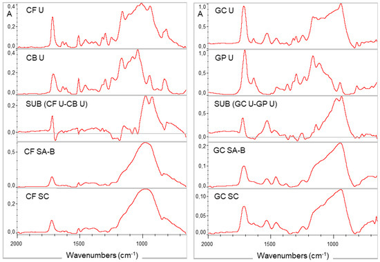 Expanded ATR-FTIR spectra of the composites (CF: Clearfil DC Core Plus; GC: Gradia Core) at an unset state (U), after self-curing without the adhesive activators (SC) and after self-curing with the adhesive activators (CB: Clearfil S3 Bond Plus; GP: G-Premio Bond mixed with a DCA activator) in contact at the bottom surfaces (SA-B). The spectra of the SA-B groups are free of adhesive spectroscopic interferences, which are resolved in the negative values of the subtraction spectra (SUB) of the unset adhesives (U) from the composites (absorbance scale, 2000–650 cm−1 wavenumber range).