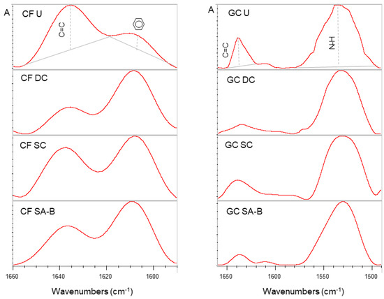 Expanded ATR-FTIR spectra of the unset (U), dual-cured (DC), self-cured (SC) and self-cured specimens in contact with the adhesive activators (SA-B) for Clearfil DC Core Plus (CF) and Gradia Core (GC) composites along with the analytical (C=C) and reference band (aromatic C..C or N–H) peak height annotations used for the degree of conversion measurements (absorbance scale, 1660–1590 cm−1 wavenumber range for CF and 1660–1490 cm−1 wavenumber range for GC).
