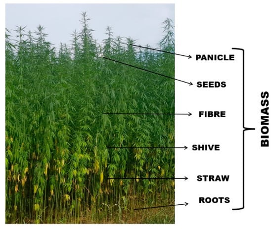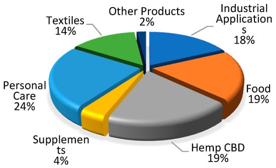 Cannabis sativa L. is a plant highly appreciated due to its strong ecological features and potential for multidirectional application. The importance of hemp has increased especially nowadays where climate change and environmental degradation are serious problems for our globe. The European Green Deal launched as Europe’s growth strategy aims to make the economy more sustainable, resource-efficient, and competitive, focusing on ensuring: no net emissions of greenhouse gases by 2050, economic growth decoupled from resource use, no person and no place left behind [1]. Hemp fits into the European Green Deal priority particularly in terms of striving to climatic neutrality in 2050. Hemp cultivation and processing cover low-carbon solution idea, 1 ha of one season of hemp growing can absorb about 10 t of CO2 from the atmosphere, depending on plant variety. Hemp is resistant to drought, its growth does not need watering or too many pesticides, as opposed to cotton. Hemp is a model example of cascading wasteless use of biomass, which is presented in a simplified way in Figure 1. Each part of the plant is raw material suitable to use in different sectors of the economy bringing benefits to farmers and industries. The hemp value chain covers wasteless processing of biomass to produce biodegradable and recyclable products. The diversity of hemp products and their quantitative share in the market is shown in Figure 2.