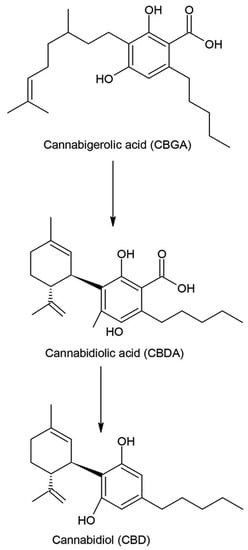 Cannabidiol (CBD) is one of at least 85 active cannabinoids identified within the Cannabis plant. Cannabidiol is a phytocannabinoid derived from Cannabis species, which is devoid of psychoactive activity, with analgesic, anti-inflammatory, antineoplastic and chemopreventive activities. Figure 4 illustrates the conversion of cannabigerolic acid (CBGA) into cannabidiol acid (CBDA) that takes place in hemp plants and the next transformation to cannabidiol (CBD) in the laboratory.
