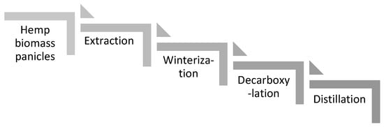 CBD is obtained from the top part of hemp, e.g., from plant panicles. Main processing steps to convert hemp biomass into high purity distillate covers trim and flowers collection, extraction with crude oil, removing of fats by winterization, activation with decarboxylation, and purification by distillation, the chain is schematically showed in Figure 5.