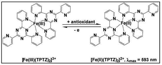 The Ferric Ion Reducing Antioxidant Power (FRAP) assay takes advantage of electron-transfer reactions, Figure 9. The ferric reducing activity (FRAP) of the fibers extracts was estimated according to the method developed by Benzie and Strain [46]. The reaction mixture contained 300 mmol/L acetate buffer, 10 mmol/L 2,4,6-tripyridyl-s-triazine (TPTZ) in 40 mmol/L of HCL and 20 mmol/L of FeCl3·6H2O. The working FRAP reagent was prepared freshly by mixing 25 mL of acetate buffer, 2.5 mL of TPTZ solution, and 2.5 mL of FeCl3·6H2O. The freshly prepared mixture was incubated at 37 °C in a water bath for five minutes and then a blank reading was taken spectrophotometrically at 593 nm. After that, 30 µL of extract or standard and 90 µL of distilled water were added to 900 µL of the working FRAP reagent. Absorbance was measured at 0 min immediately upon addition of the working FRAP reagent after vortexing. Thereafter, absorbance reading was taken after four minutes [36,47]. Three repetitions of the antioxidant test were conducted for each fiber sample.