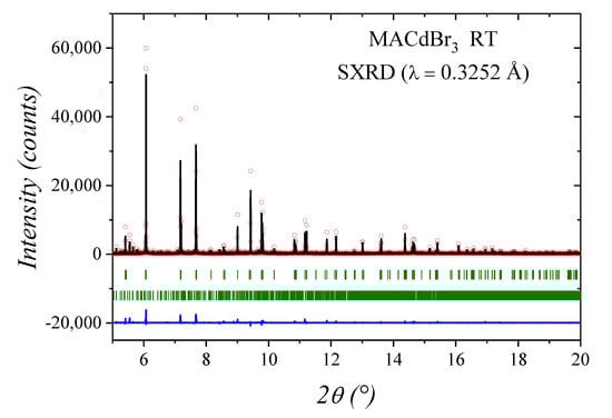 - Kallel, A.; Mlik, Y.; Courseille, C.; Couzi, M. Structural phase transition in single-crystal CH3NH3CdBr3: I. Experimental studies. J. Phys. Condens. Matter 1992, 4, 7179–7190. [Google Scholar] [CrossRef]