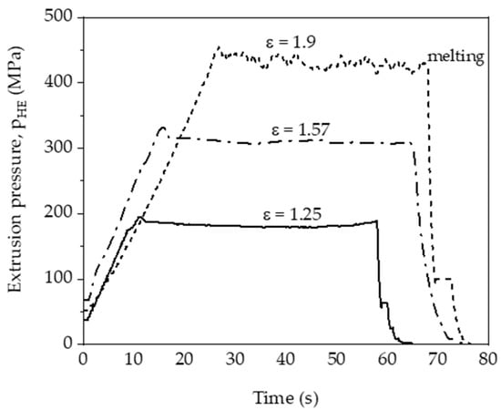 However, at a true strain ε = 1.9, the pressure was not stable and the product after the HE process was inconsistent (Figure 3).