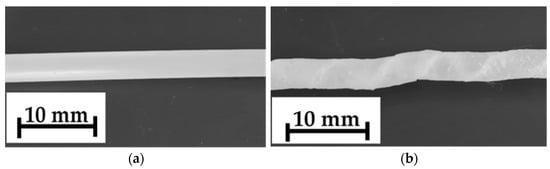 Based on the course of the (DSC) curve, the glass transition temperature (Tg) was determined, which was 35 °C. The analysed HE processes of the PA6 polymer were performed at adiabatic temperature in the range of Tad = 40–211 °C, so at a temperature above the Tg level. The second transformation in the DSC thermal curve is the endothermic transformation of the polymer crystalline phase melting. This transformation is described by the initial melting temperature (Tonset = 208 °C), the melting point temperature Tm = 221 °C and the melting enthalpy ΔHm = 67 J/g. The melting process begins at around 166 °C (Ts). Since the Tad of the sample E_1.90_7 subjected to the HE process is higher than the melting process beginning, some of the crystallites melt during the HE process. The consequence of this is the formation of a porous and rough surface on the rod after the HE process. When the HE process pressure is stable, the rods are characterised by a smooth surface with low roughness along the entire length (Rand = 0.82 μm) as is shown in Figure 5a for the sample D_1.57_5. For the sample E_1.90_7 (Figure 5b) with ε = 1.9, when the pressure during the HE process was unstable, the surface of this sample had a much greater roughness (Rand = 2.68 μm), and spiral cracks were noticed on the extruded rod.