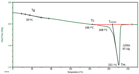 DSC thermal curve of the PA6 sample A. Where: differential scanning calorimetry (DSC), glass transition temperature (Tg), temperature where melting process begins (Ts), initial melting temperature (Tonset), melting point temperature (Tm), melting enthalpy (ΔHm).