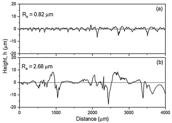 The roughness tests were carried out using the HOMMEL TESTER T8000 profilometer by Hommelwerke (Villingen-Schwenningen, Germany) and a HOMMEL-ETAMIC TKU300/600 contact head with an apex radius of 2 μm. The head travel speed was 0.5 mm/s. The roughness parameter was obtained, i.e., the arithmetic mean value of the ordinates of the roughness inside the elementary Section l. This value was calculated by the TurboWave software (V7.4, 2015, Hommelwerke GmbH, Villingen-Schwenningen, Germany) using Equation (2):