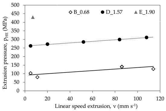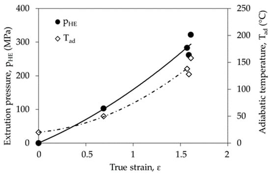 where: W—mechanical work of plastic deformation performed during extrusion (J); pHE—extrusion pressure (MPa); c—specific heat (J/g K) and ρ—density (g cm−3) and —share of mechanical work that has been converted into thermal energy (0.95 was adopted for the HE processes).
