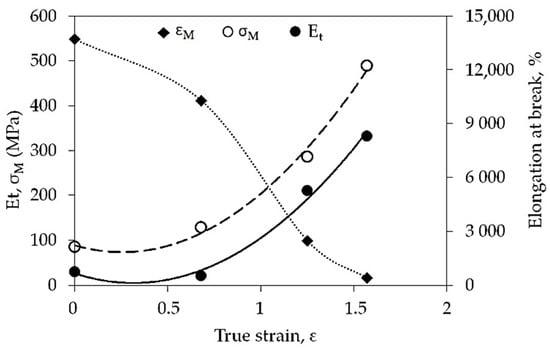 Relationship of mechanical properties determined the tensile test as a function of strain after PA6 cold hydrostatic extrusion (HE). Where: tensile modulus (Et), elongation at break (εM), tensile strength (σM).
