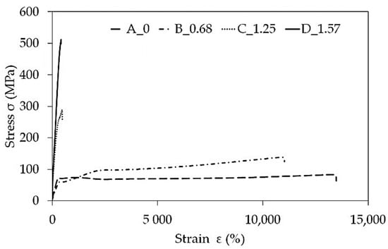 Changes in the mechanical properties of the PA6 polymer after the hydrostatic extrusion process, and measured statistic tensile tests, are shown in Figure 8 and Figure 9.