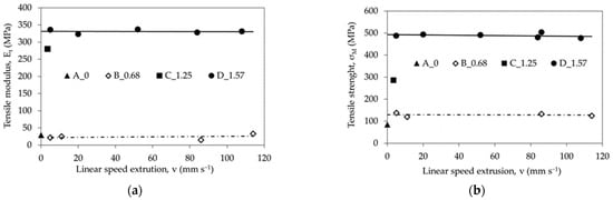 The influence of HE processes linear speed extrusion on mechanical changes: (a) tensile modulus (Et), (b) tensile strength (σM).