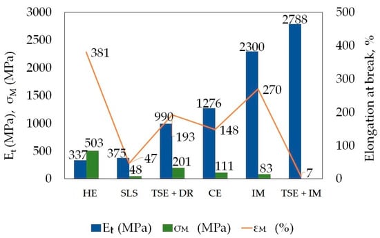 Comparison of the mechanical properties determined in the PA6 polymer tensile test after processing using different techniques. Where: hydrostatic extrusion (HE), selective laser sintering (SLS), twin-screw extrusion (TSE) and cold-drawing (DR), solid-phase extrusion (CE), injection moulding (IM).