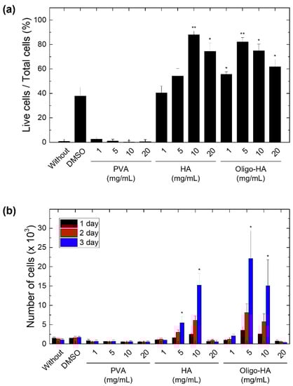- Khetan, S.; Corey, O. Maintenance of stem cell viability and differentiation potential following cryopreservation within 3-dimensional hyaluronic acid hydrogels. Cryobiology 2019, 90, 83–88. [Google Scholar] [CrossRef] [PubMed]