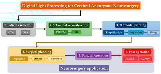 The aim of the study is to assess the feasibility of the direct light processing 3D printing technique to reproduce, in a low-time, inexpensive, and accurate way, the anatomical structure of cerebral aneurysms and the surrounding vessels for neurosurgeon training and surgical operation planning. To this end, the activity concerned six main steps, as shown in Figure 1 and detailed in the next sections.