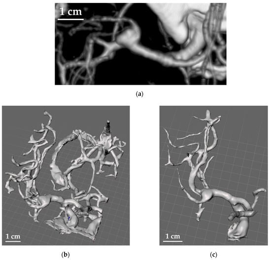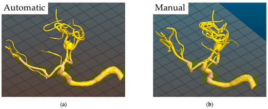 In general, the elaboration of the CTAs or DSAs through the automatic process is quicker, but it sometimes results in a lower definition, especially for CTAs, requiring the performance of a manual evaluation of the images’ contours (see Figure 3). The suggestion is, therefore, to perform a manual elaboration for the CTAs and an automatic elaboration for the DSAs. Moreover, it is worth noting that both the time needed for the elaboration of the STL file (i.e., ) and for the preparation of the 3D model for printing and post-processing operations (i.e., ) strongly depends on the operator’s experience.