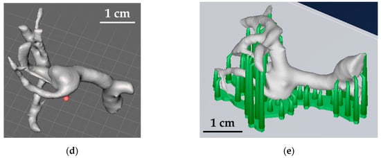 The results were converted to an STL file, and the obtained models were further edited to remove non-essential structures with the help of the neurosurgeons by using the software Meshmixer® (by Autodesk, San Rafael, CA, USA), Figure 2c,d. In fact, since the manufacturing time is governed by the number of layers to be printed, it was necessary to minimize the size of the aneurysm along the Z-axis (i.e., the printing direction). After the appropriate simplifications, the support structures necessary for the printing process were properly added, and, finally, the models were sliced in the optimal build orientation with the software Pyramis® (by CIMsystem, Milan, Italy), Figure 2e. In this case, for the support structure, pillars with circular sections were used with connection pins reduced to a minimum diameter of about 0.3 mm, able to guarantee a good connection with the model and, at the same time, easy removal. These were added manually to avoid the piercing of the pillars through the branches of the aneurysm and to ensure that they were enough to efficiently support the complex structure of the model.