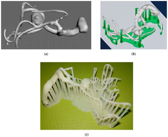 Patient #2 aneurysm reproduction and printing: (a) 3D model reconstruction of the aneurysm after simplification suggested by the neurosurgeons; (b) 3D model preparation for printing; (c) 3D printed model before the removal of the support structures.