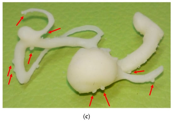 Patient #3 aneurysms reproduction and printing: (a) 3D reconstruction of DSA showing the L-ICA (light blue) and the L-MCA (light green) aneurysms; (b) 3D printed model showing the support structure before removal; (c) 3D printed model after the removal of the support structures (the red arrows indicate the positions of the supporting pins).