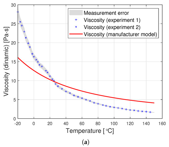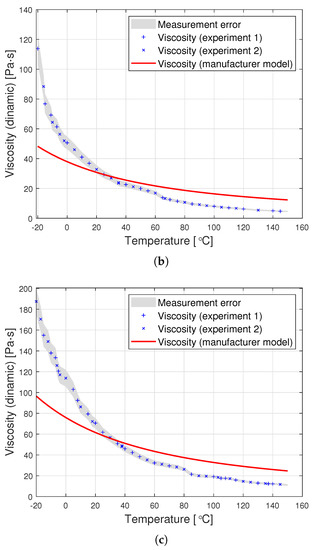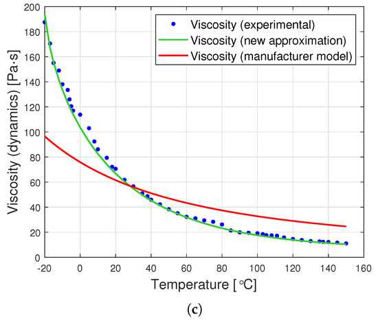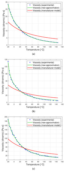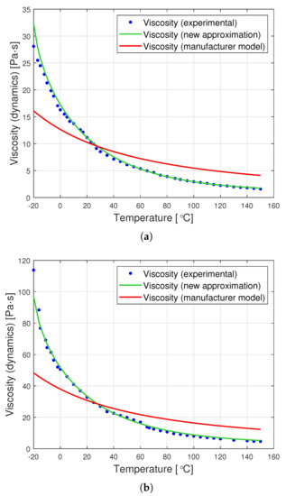 The graphs in Figure 8 are a graphic representation of the approximation (13). They show the results of the experimental measurement of the dynamic viscosity of the tested oils, the producer’s model, and the proposed joint approximation method (13). It is clearly visible that also the proposed approximation demonstrates a very good fit to the empirical data.