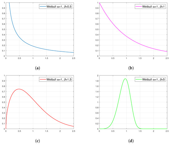 Examples of density plots for the Weibull distribution with specific parameters: (a) , (b) , (c) and (d) .