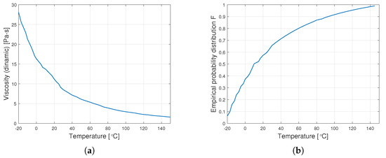 Transition from data on dynamic viscosity to the distribution function (a) graph of empirical dynamic viscosity for an oil with a nominal kinematic viscosity of 10,000 cSt, (b) empirical distribution function.