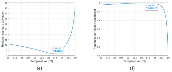 Graphs of the residual standard deviation and the Pearson correlation coefficient for oils of nominal kinematic viscosities: (a,b) 10,000 cSt, (c,d) 30,000 cSt, (e,f) 60,000 cSt.