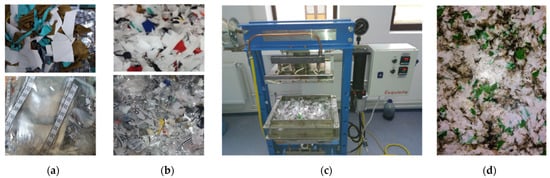 The stages of the technological thermoforming process: (a) pre-and post-production waste; (b) cutting; (c) mixing, thermoforming and cooling; (d) waste-based composite panel.