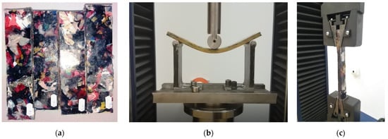 The mechanical properties of the obtained waste-based composite materials were evaluated from a tensile and flexural point of view using the LBG TC10 testing machine equipped with a 10kN load cell, taking into consideration the specifications of SR EN 300:2006 [] and SR EN ISO 527-4:2000 standards []. For each sample, a series of five tests were performed according to the standards mentioned above. In addition, the SR EN 300:2006 standard has been used to compare with 8 mm OSB boards.