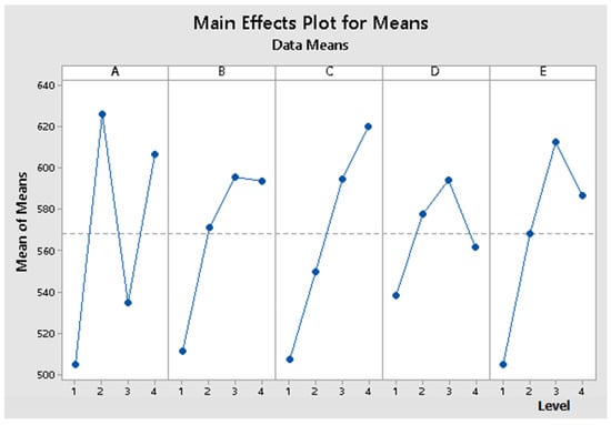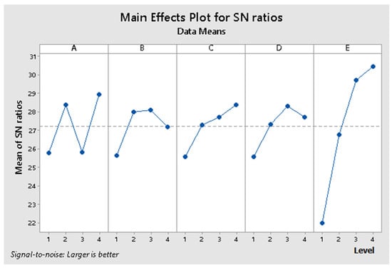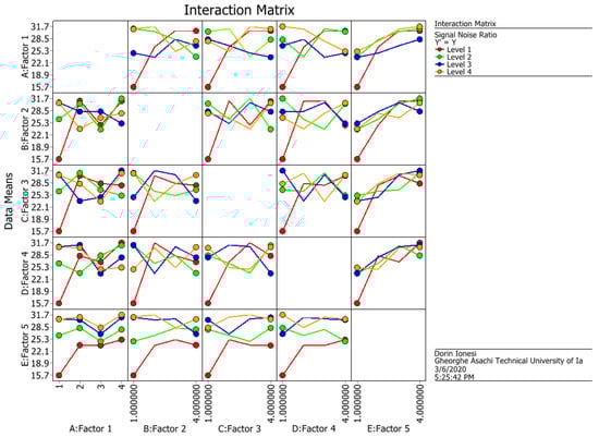The values obtained for the S/N ratio and means from Table 3 are graphically represented in Figure 6 and Figure 7, and the interactions between factors are graphically represented in Figure 8 and Figure 9.
