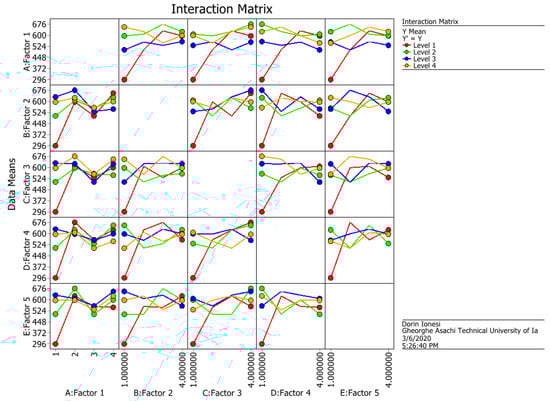 From the S/N ratio point of view, it can be remarked that factor E has a low variation on the 3rd and 4th levels. Still, according to means analysis made across the same levels, the 3rd one has a high influence over the properties of the designed composite material. Therefore, by combing the obtained results for S/N ratio and means analysis, the optimum signal factors combination is A4 B2 C4 D3 E3, representing a composite material that uses the BOPP + TNT as a matrix, a temperature of 190 °C, thermic treatment time of 25 min, pressing force 108 N/cm2 and 40% Matrix proportion.