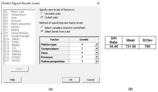 By analyzing the results obtained for the S/N ratio, the optimal combination of signal parameters is A4 B2 C4 D3 E4, representing a composite material that uses the BOPP + TNT as matrix, a temperature of 190 °C, thermic treatment time of 25 min, 108 N/cm2 and 50% Matrix proportion. By analyzing the results obtained for means, the optimal combination of signal parameters is A4 B3 C4 D3 E3, representing a composite material that uses the BOPP + TNT as the matrix, a temperature of 180 °C, thermic treatment time of 25 min, pressing force 108 N/cm2 and 40% Matrix proportion.