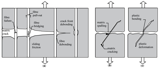 (a) A schematic illustration of some of the toughening effects and crack front debonding, the Cook–Gordon effect [14], and debonding and sliding in the crack wake; (b) matrix spalling and matrix cracking; (c) ductile bending (deformation) of inclined fiber during pull-out—both at the crack and at the end-anchor [13].