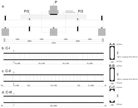 Figure 3. Beam specimen in series (a) diagram of measurement points (b) C-I, (c) C-II, and (d) C-III. - Series C-II—stirrups with spacing twice as large and the volume is 150 or 300 mm; pursuant to EN 1992-1-1 [31] (Figure 3c);
