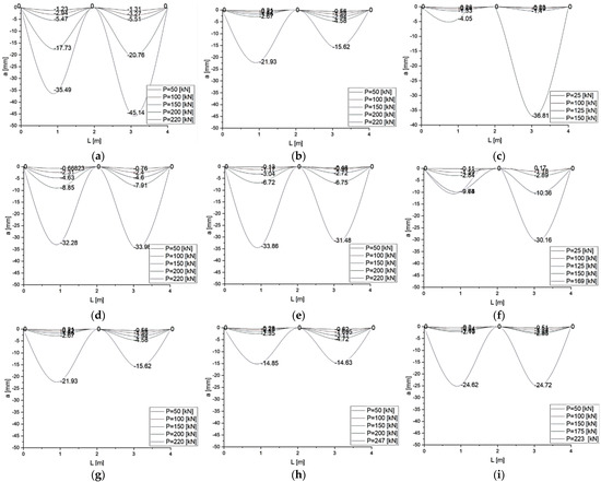 Relationships between force P [kN] and mean deflection a [mm] in the spans of series: (a) C-I-W0; (b) C-II-W0; (c) C-III-W0; (d) C-I- WS78.5; (e) C-II- WS78.5; (f) C-III- WS78.5; (g) C-I-WB5; (h) C-II- WB5; (i) C-III-WB5.