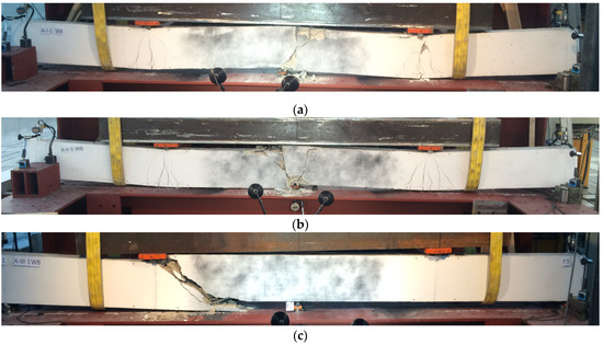 Failure modes for tested beams in series (a) C-I-WB5; (b) C-II-WB5; (c) C-III-WB5.