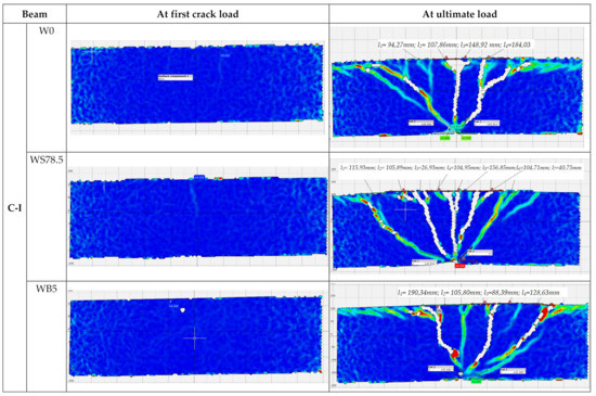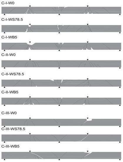 As expected, failure of the C-I series occurred due to bending. In addition, the presence of steel fibers in concrete resulted in the brittle nature of beams changing to quasi-ductile. First cracks in the beams in this series appeared on the central support at a load of 76.7 kN (0.3 Pult) in the C-I series, at 90 kN (0.4 Pult) in C-I-WB5 series, and at 86.7 (0.3 Pult) in C-I-WS78.5 series (Figure 8). As the load increased, new cracks appeared perpendicular to the axis of the element. A redistribution of bending moments could be observed in the beams. Both spans were cracked symmetrically. Failure of reference beams and beams made of concrete with basalt fibers occurred as a result of bending at mid-span and on the central support. In the final stage, failure was quite sudden and its nature was brittle, with the characteristic sound of cracking. C-I-WS78.5 series beams behaved like a ductile object. As the force increased, the existing cracks expanded, but no new ones appeared. At failure stage, the beams were severely cracked at mid-span. The distribution of cracks remained unchanged and its maximum value in the final stage was 184 mm (C-I-W0) in reference beams, and 156 mm (C-I-WS78,5) in beams made of concrete with steel fibers. Beams made of concrete with basalt fibers were characterized by the greatest spacing between cracks on the central support (190 mm). In all the test series, diagonal cracks appeared on the central support; in reference beams and beams made of concrete with basalt fibers, and also at the extreme supports. Diagonal cracks appeared on the central support at the following load levels: C-I-W0–0.7 Pult; C-I-WB5–0.8 Pult. In the case of beams made of concrete with steel fibers, diagonal cracks were observed just before failure. The measured angle of diagonal beams on the central support in all C-I beams just before failure was approx. 50° in the direction of the less damaged span (lower stiffness). Later, the beams failed due to clear separation of localized cracks. The number of perpendicular and diagonal cracks as well as the inclination angle of the diagonal crack observed during the test in reference beams were the highest.