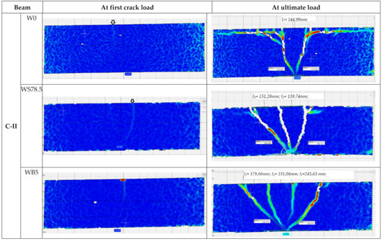 During the test, development of cracks in of all the tested beams were monitored as shown in Figure 6 and Figure 7. The main deformations of beams were recorded using the GOM ARAMIS optical data acquisition system—Digital Image Correlation. The characteristic images of deformations at first crack and immediately before failure in the central support area are shown in Figure 9. On the deformation maps, the lighter areas indicate a deeper extent of the tensile zone in the concrete, induced by severe cracks just before failure.