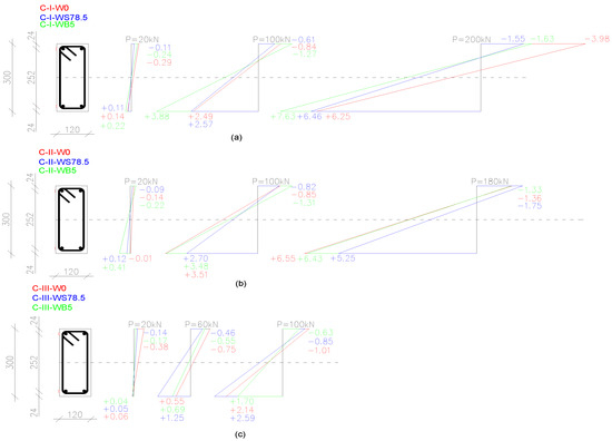 Comparison of average deformations ε [‰] at the top and bottom of concrete members at different load levels P [kN] in beam series: (a) C-I; (b) C-II; (c) C-III (the lines connecting the points are for reference).