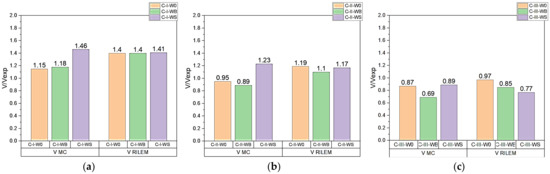 A comparison between experimental force VExp [kN] and theoretical calculations performed pursuant to fib Model Code 2010 (VMC) and RILEM TC 162-TDF 2003 (VRILEM) for series: (a) C-I; (b) C-II; (c) C-III.