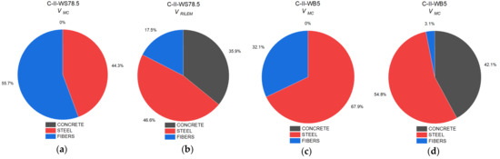 Figure 13 shows a comparison of the proportional role of capacity as assigned to concrete cross-section, longitudinal reinforcement, and the presence of fibers in the total shear capacity of series with basalt or steel fibers. Beams made of concrete with steel fibers were characterized by a higher value of shear capacity than beams made of concrete with basalt fibers. The basic parameters in Equations for the calculation of shear capacity of fiber concrete is residual tensile strength at bending, which in the case of concrete with steel fibers is much higher than that for concrete with basalt fibers.