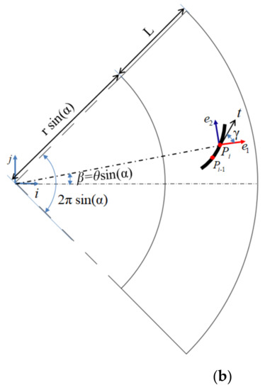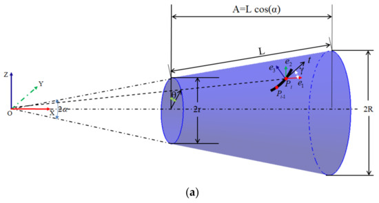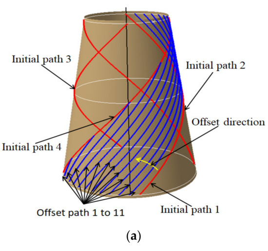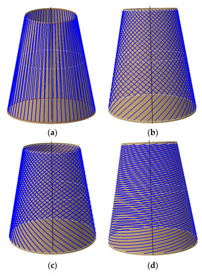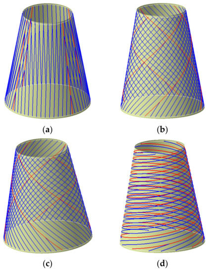 The composite material can be treated as a material or a structure, whose one outstanding advantage is the designability of performance. Therefore, composite components with different properties can be obtained by different ply directions and ply forms [29]. The quality of path planning directly affects both the quality of offset paths and the mechanical properties of the components. At present, the commonly used path planning methods mainly include fixed angle, geodesic, and variable angle methods [30]. The fixed angle algorithm meets the requirements of structural design, but it is easy to produce wrinkles [31,32]. Compared with the fixed angle method, the geodesic method has an infinite curvature radius and no wrinkle will occur. However, it is very easy to cause the angle deviation to exceed its upper limit, which results in great difference between the actual performance of the component and the design value [13,33]. The variable angle path planning method is an ideal solution for the placement of composite conical shells at present because it comprehensively considers the angle deviation and path curvature.