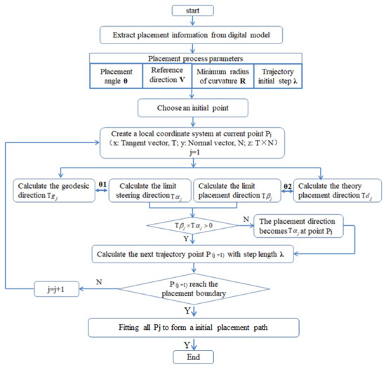 - The initial point is extremely important to the initial path and offset paths. If the initial point selection is unreasonable, on the one hand, which will lead to the failure of path generation because the occurrence of path turns back and cannot reach the boundary, on the other hand, when taking the initial point close to the boundary, the angle deviation can reach more than 20°, which cannot meet placement requirement. Therefore, it is necessary to iteratively optimize the initial point to design the initial path to make it have the best laying quality.