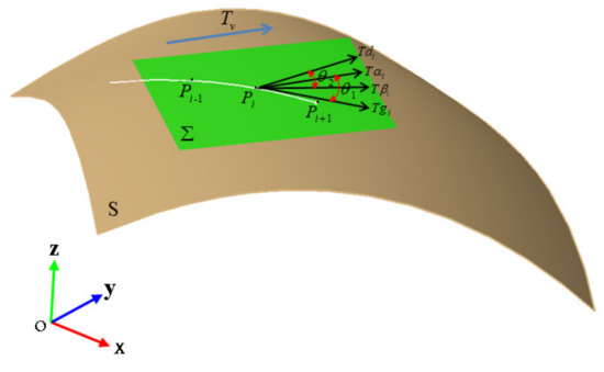Step 2. Calculate the normal vector N () of the surface at the points and the reference direction is projected onto the tangent plane to obtain the projection vector at the points , the coordinates of are obtained by the following formula: